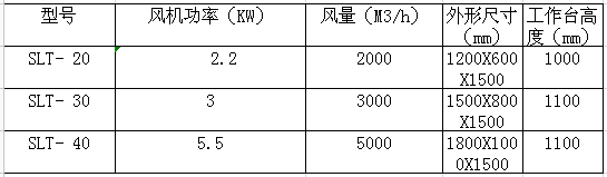 SLT系列集塵工作臺 該工作臺可以從源頭上捕集生產(chǎn)過程中產(chǎn)生的打磨粉塵,焊接以及等離子切割的煙霧。集塵工作臺配有粉塵過濾裝置、電氣控制系統(tǒng)并可選配動力裝置,可使工件進行水平或垂直方向的回轉(zhuǎn),以提高勞動效率,并可為客戶要求提供專業(yè)的集塵工作平臺?,F(xiàn)廣泛應(yīng)用于焊接、打磨和等離子切割,也可去毛刺,非金屬和金屬工件表面拋光、磨光。 SLT粉塵過濾裝置自帶式工作臺的特點是放置隨意,維修方便,生產(chǎn)工藝可進行柔性編排。 SLT工作臺粉塵通過風(fēng)機產(chǎn)生的負壓經(jīng)正面排風(fēng)口和下排風(fēng)口進入凈化器,氣流進入導(dǎo)流通道,大顆粒粉塵與導(dǎo)流板碰撞后,大顆粒粉塵在重力的作用下落入集灰抽屜,含細小顆粒的粉塵進入過濾室,含塵氣體由濾袋外表面穿過濾芯,粉塵則被濾芯阻攔在其表面,當(dāng)被阻攔的粉塵在濾芯表面不斷沉積時,通過手動清灰機結(jié)構(gòu)清掃濾芯,也可通過脈沖噴吹對濾筒清灰使得沉積在濾芯上的粉塵顆粒在振動的作用下脫離濾芯表面落入集灰抽屜中,使得整個濾芯表面都得到清掃,凈化后的潔凈空氣由風(fēng)道、經(jīng)風(fēng)機排出。獨特的臺式設(shè)計,并配有工作燈、打磨機電源插孔、夾具安裝孔,兩側(cè)板可隨時打開,方便較大工件使用。